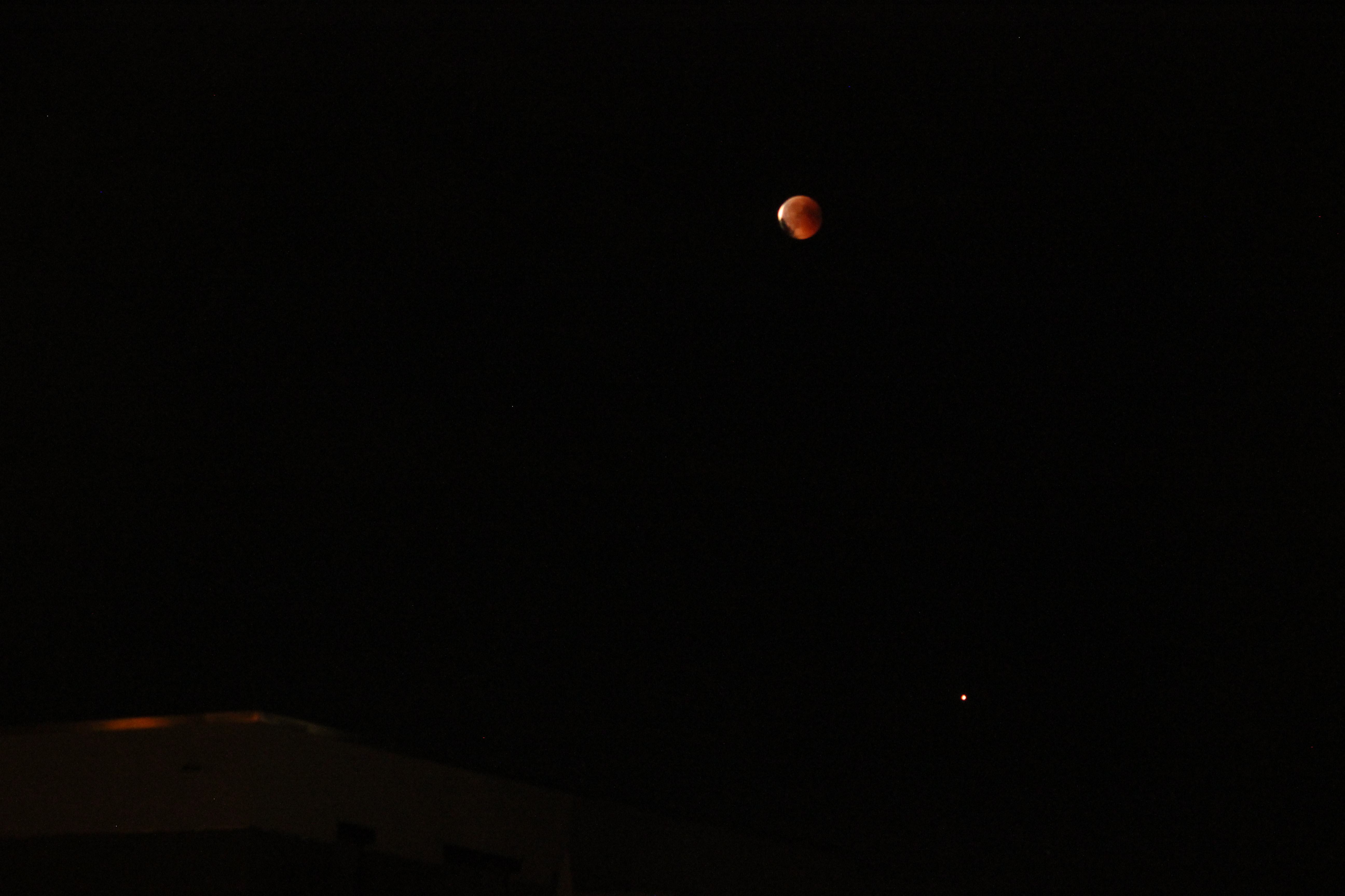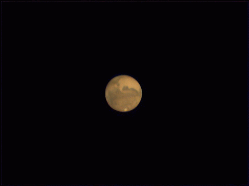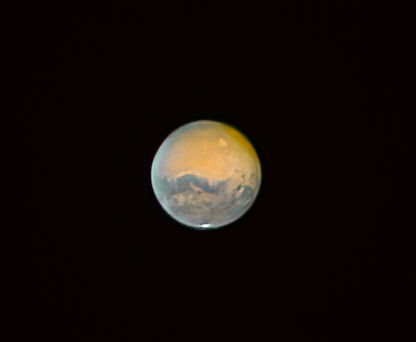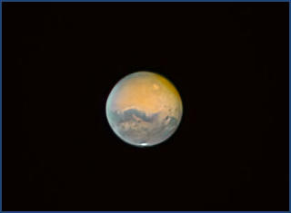 Der Mars ist unserer äusserer Nachbar im Sonnensystem, zwar kleiner als die Erde, aber ansonsten am erdähnlichsten, abgesehen von der dünnen CO2-Atmosphäre und der geringeren Schwerkraft. Man nennt ihn auch den roten Planeten, da er von einer orangeroten Staubschicht bedeckt ist. Moderne Videotechnik ermöglichst heute auch Amateuren Aufnahmen wie die untenstehende von Jörg Dubiel / Dieter Ludwig vom 10. Okt. 2020 (Nachbearbeitung 2021).In dieser Videoanimation sind sogar 90 min der Marsrotation zu beobachten.Nach der Venus ist der Mars der zweithellste Planet am Nachthimmel. Im Gegensatz zu den inneren Planeten Merkur und Venus stehen die äusseren Planeten die ganze Nacht am Himmel. Die oben stehende Aufnahme von Joachim Emmert zeigt den hellen Mars rechts unter dem Mond am Ende einer totalen Mondfinsternis am 27. Juli 2018.