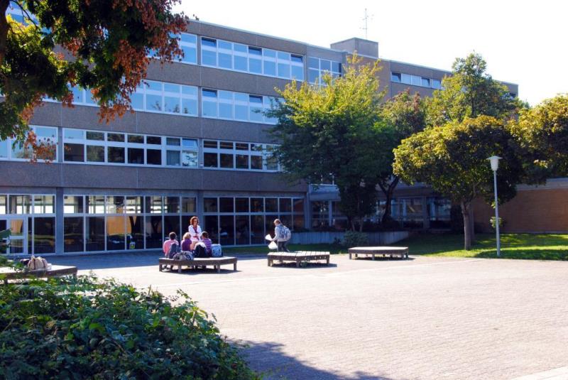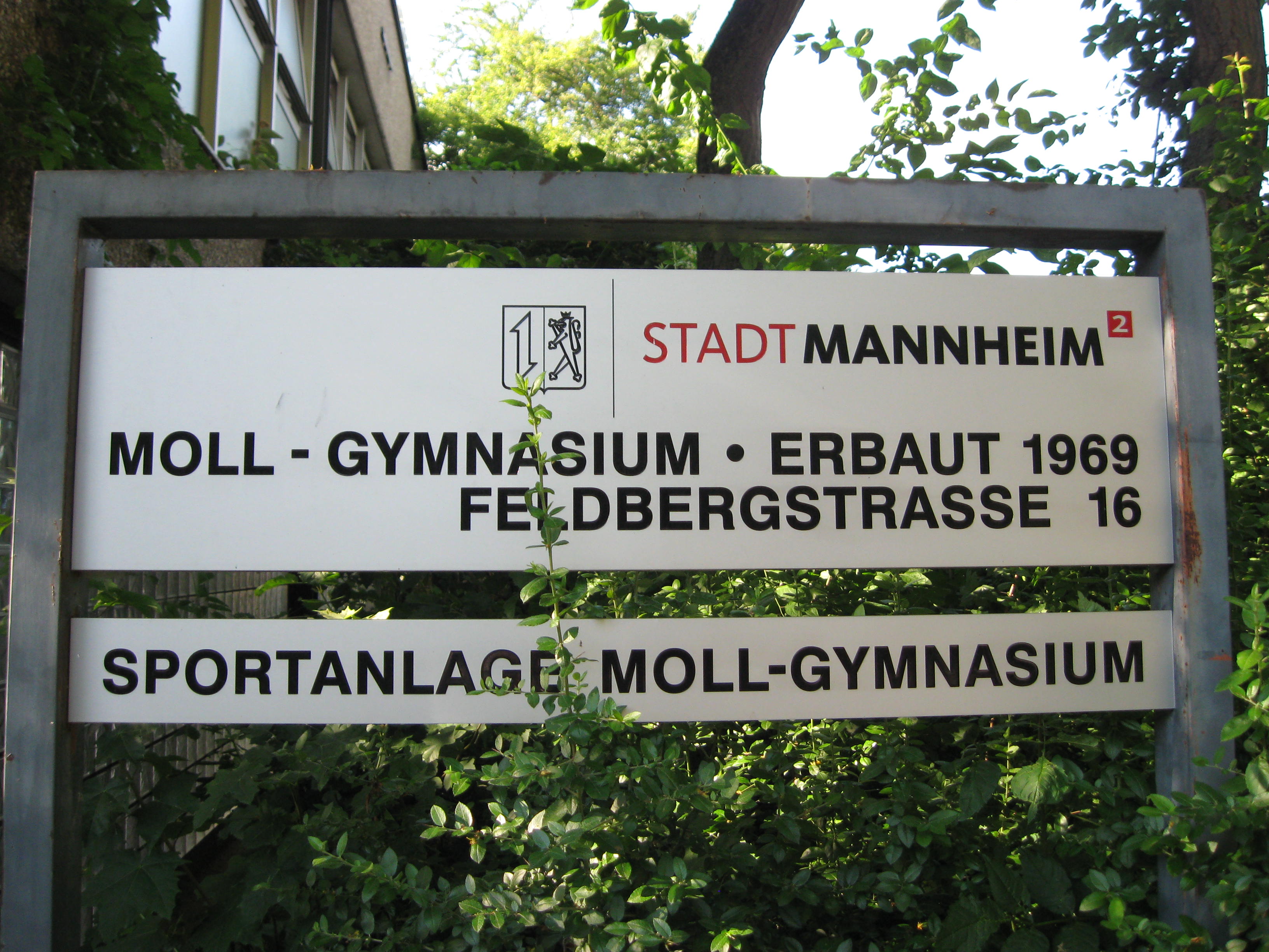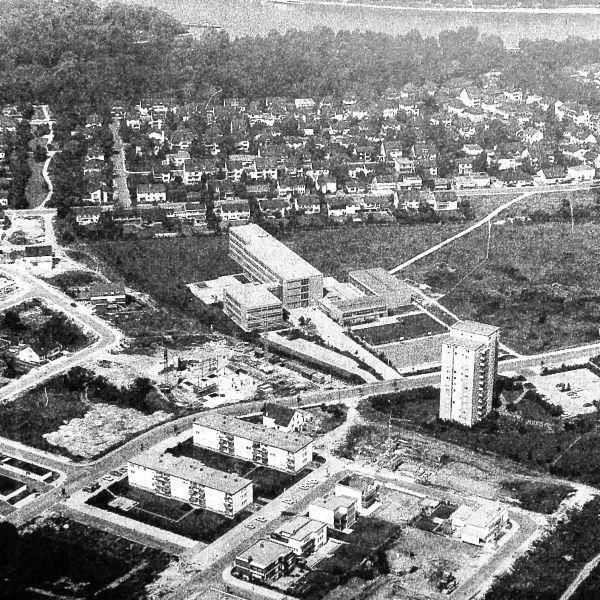 Es war Ende August 1969, Woodstock und der alljährliche Besuch in der DDR vorbei, im September sollte die Schule wieder beginnen, aber wir hatten Bescheid bekommen, dass für uns die grossen Ferien noch etwas länger dauern würden, weil das neue Gebäude noch nicht fertig war. Erst am 18. September sollte es für uns weiter gehen. Das waren noch fast 3 Wochen Ferien im September, die wir als Jugendliche natürlich intensiv nutzten, auch um unseren neuen Schulweg zu erkunden. Waren doch z.B. Karl-Heinz, ich und Lutz (Knakrügge) immer nur zu Fuss in die Schule gegangen. Der Weg in den Mannheimer Süden war aber weit und nur mit Fahrrad oder Bus/Bahn zu bewältigen. Die Gegend zwischen Lindenhof und Almenhof, hinter dem Diakonissen-Krankenhaus, wo das neue Gebäude stand, kannte ich ein bisschen durch die Besuche bei Rosel Voitel, der Freundin meiner Mutter. Entsprechend wusste ich auch, dass man dorthin mit dem Bus der Linie 71 fuhr. Dass auch der 75er zielführend war, hat sich dann bald auch herausgestellt. Es führen ja oft viele Wege nach Rom; in diesem Fall z.B. auch mit dem Fahrrad. Das war, zumal es ja noch Spätsommer war, auch unser erstes Ziel. Deshalb haben wir an einem Morgen vor Schulbeginn eine Fahrradtour dorthin gemacht. Karl-Heinz und ich, seine Freundin Anette war auch dabei, vielleicht sogar Lutz, das weiss ich nicht mehr so genau. Über die Kurpfalzbrücke, durch die Innenstadt, am Schloss vorbei und am Rhein entlang, an der Speyerer Str. hoch und schliesslich in die Bellchen-Str. rein und über den Fussgängerweg von dort zum neuen Schulgebäude (Bildmitte im Luftbild von damals). Heute steht am Ost- bzw. Haupteingang dieses Schild, aber das gab es damals noch nicht. Dafür war das Ganze noch zu sehr Baustelle, aber das fiel uns bei unserem ersten Besuch noch gar nicht so sehr auf. Dafür umso mehr ein freundlicher Mann, der uns ganz herzlich begrüsste und uns den Fahrradkeller zeigte. Er stellte sich als Hr. Alt vor und er sei der neue Hausmeister. Welch ein Kontrastprogramm zu dem alten Hausbesen Werle vom alten Haus in der Neckarstadt! Und es sollte sich zeigen, dass unsere Beobachtung nicht falsch war. Hr. Alt sollte für mehr als 20 Jahre der gute Geist und die „Seele“ des Neuen Moll werden. Für viele Schülerjahrgänge blieb er unvergesslich, der resolute, aber menschlich angenehme Sozialdemokrat und Waldhof-Fan. Auch wir hatten noch unsere ganz persönliche Geschichte mit ihm, allerdings erst nach dem Abitur. Jetzt besichtigten wir erst mal unsere neue Wirkungsstätte und waren beeindruckt, vor allem von der Grösse. Dass es noch gewaltig hakte, erfuhren wir erst nach Unterrichtsbeginn.