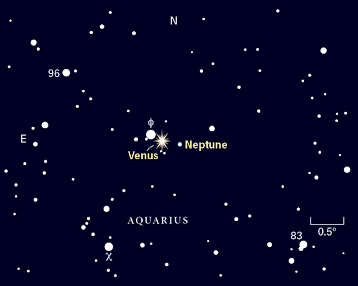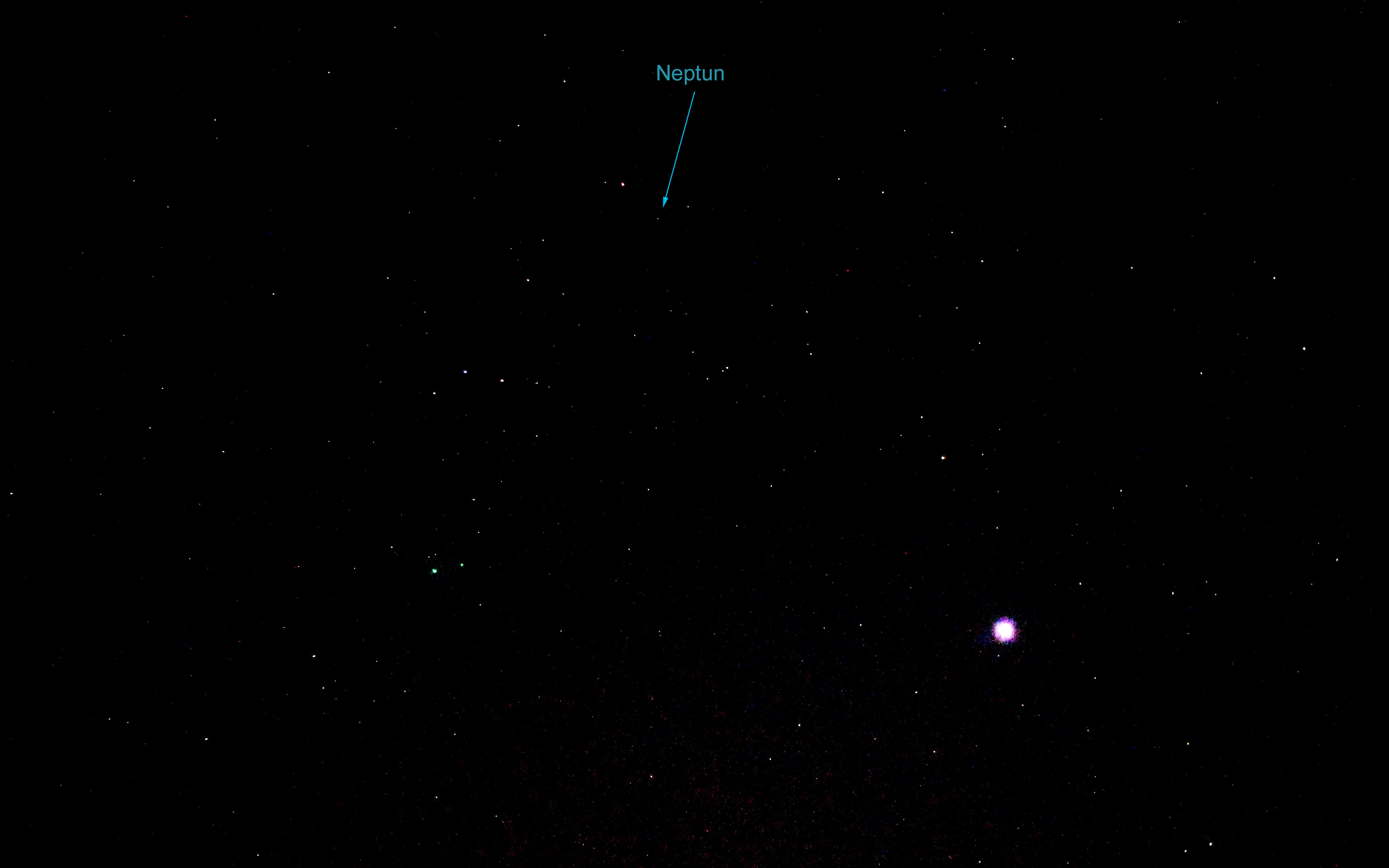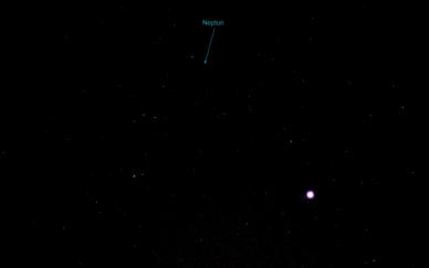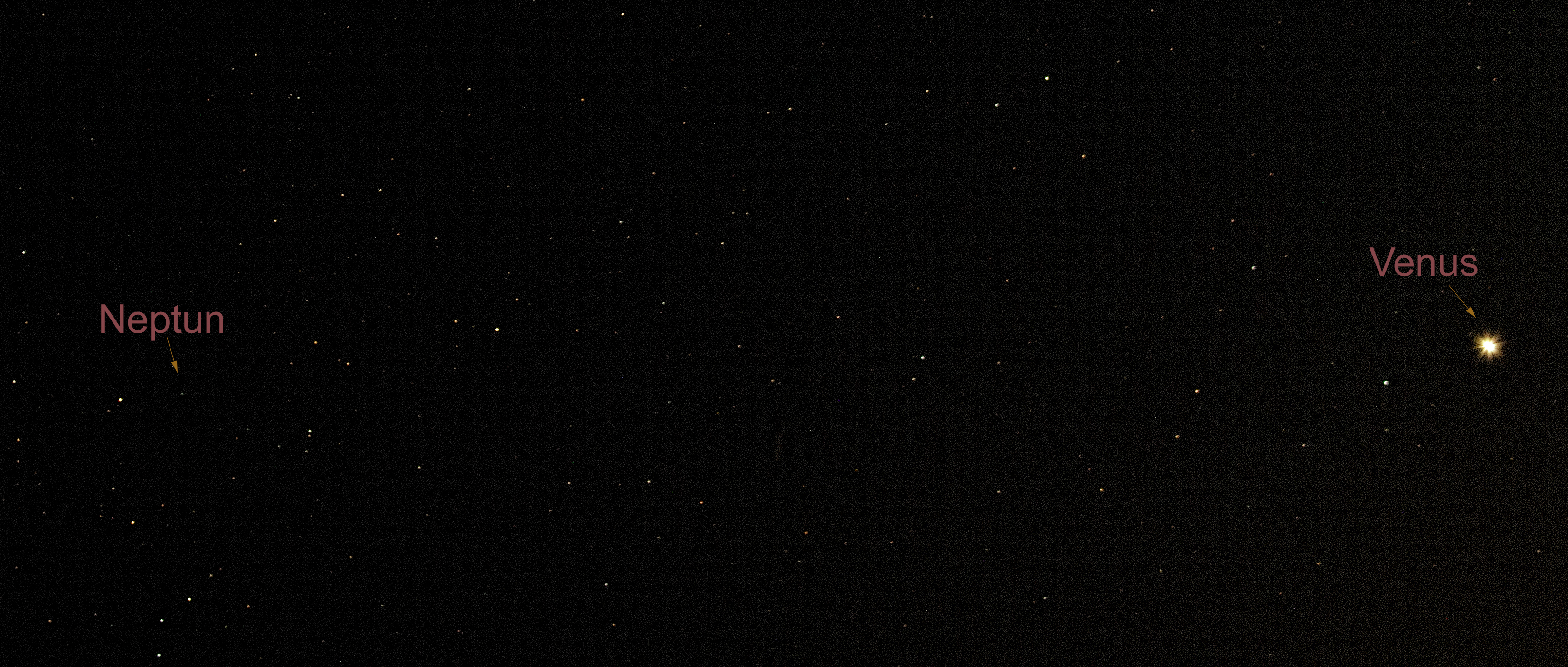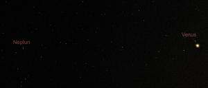 Neptun ist der 8. und äusserste Planet unseres Sonnensystems und zählt auch zu den Eisriesen. Seine Entfernung von der Sonne beträgt im Mittel 4.500 Mio km, seine Helligkeit am Nachthimmel +7,7 Grössenklassen; er ist somit nicht mit blossem Auge zu sehen. Im Fernrohr erscheint er als winziges 2” grosses, bläulich schimmerndes Scheibchen. Oberflächendetails wurden nur durch die Voyager-Sonden erkundet. Es ist somit mit Amateurmitteln von der Erde aus nur möglich, Positionsfotos des Planeten zu machen.Am 27. Jan. 2020 kam es zu einer spektakulären Begegnung (Schema) zwischen Venus und Neptun am Abendhimmel (0,5° Abstand). Die konnte zwar im Fernrohr beobachtet, aber nicht aufgenommen werden, wg. des grossen Helligkeits-Unterschiedes (-3,5 versus +7,7). Die Fotos oben wurden vor der grössten Annäherung gemacht. Aufnahme am 11. Jan. 2020, Jörg Dubiel (Canon 70 D, 135er Tele) und am 21. Jan. 2020, Joachim Emmert (Canon 600 D mit 70mm-Tele).